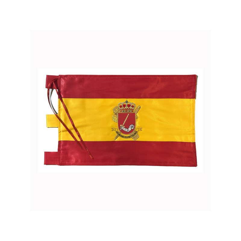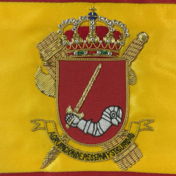 Bandera de España de escritorio bordada a mano en relieve con escudo de la Agrupación de Reserva y Seguridad de la Guardia Civil en una cara.