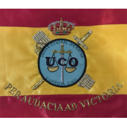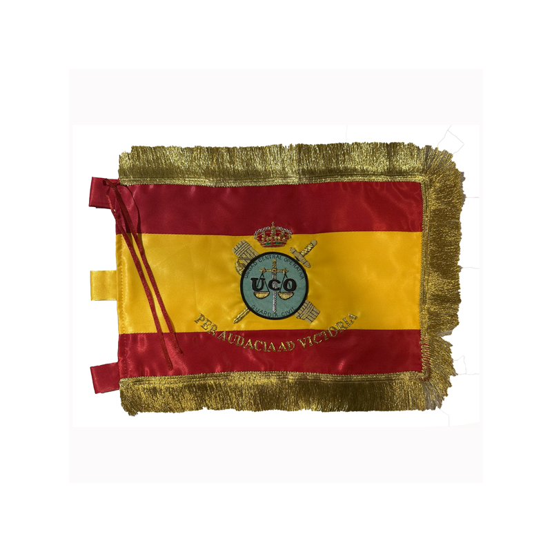 Bandera de España de escritorio con flecos bordada a mano en relieve con escudo de la Unidad Central Operativa de la Guardia Civil en una cara.