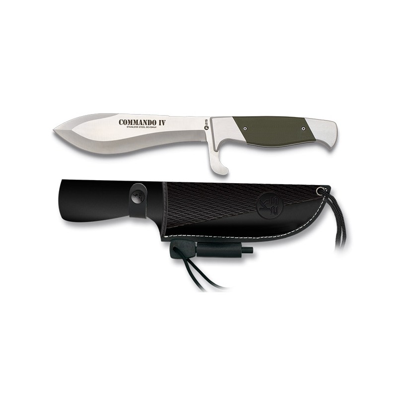 Cuchillo de la marca K25 modelo COMANDO IV, tiene una longitud total de 26 cm. y está inspirado en el famoso cuchillo de operaciones especiales. Consta de una hoja fabricada en acero Inox 8CR13MOV de 4 mm de grosor y 14,5 cm. de largo, la empuñadura mide 11, 5 cm. fabricada en acero y polímero G-10 verde. Funda de piel de color negra con apertura rápida y pedernal.