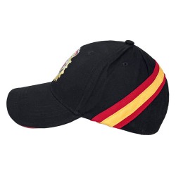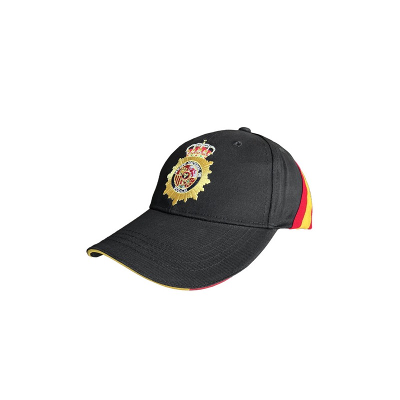 Gorra con Banderas de España y escudo bordado de Policía Nacional. Ajustable por la parte posterior mediante hebilla metálica. Disponible en los colores Azul negro y blanco.