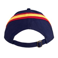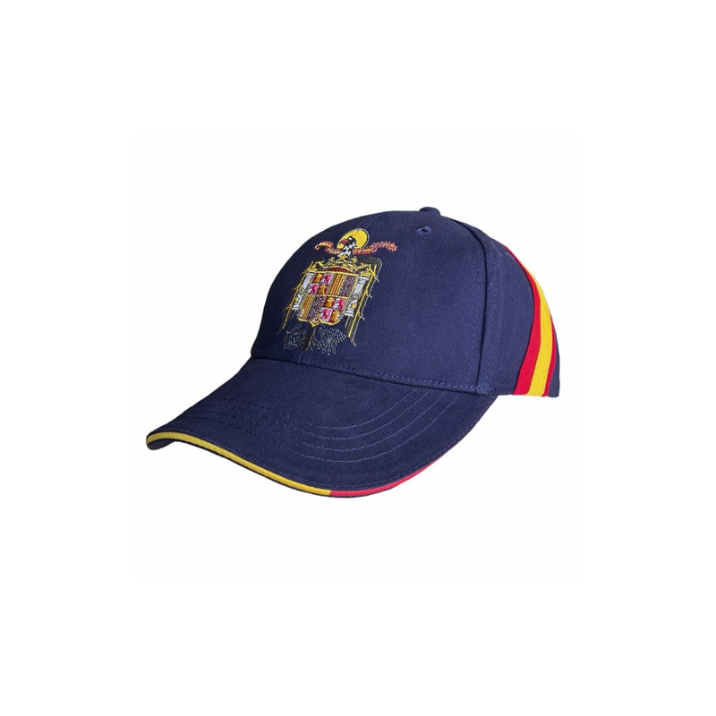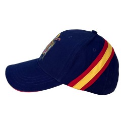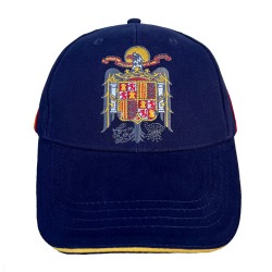 Gorra con Banderas de España y escudo bordado del Águila de San Juan. Ajustable por la parte posterior mediante hebilla metálica. Disponible en los colores azul, negro y blanco.