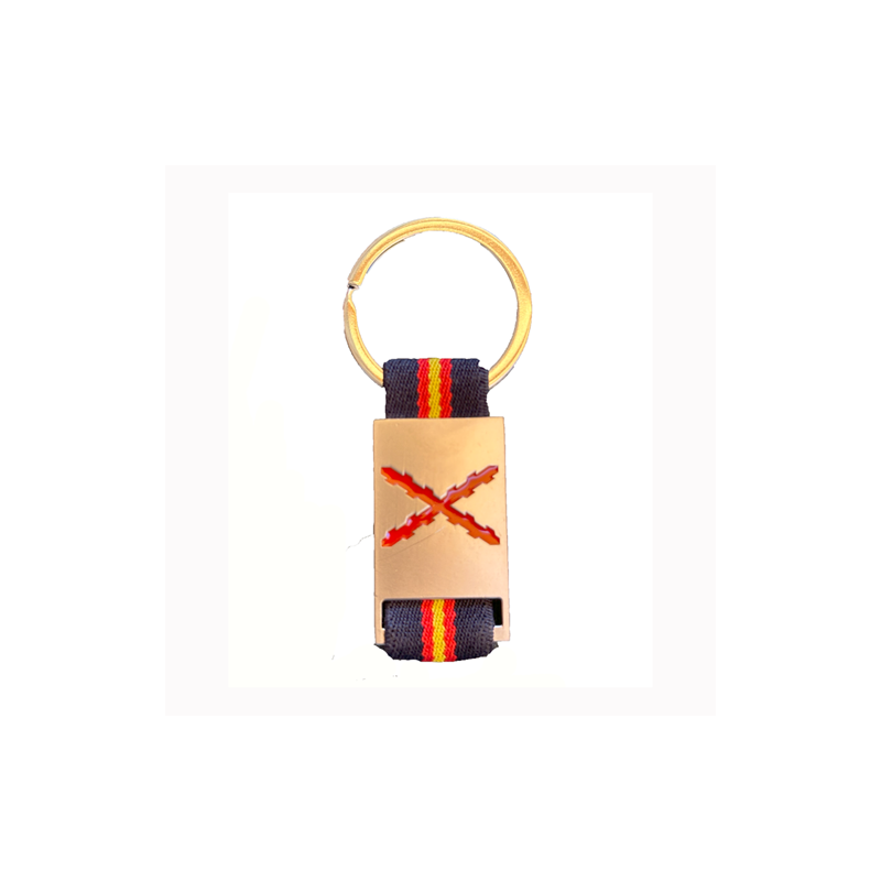 Llavero con cinta de Bandera de España con fondo azul y escudo de los Tercios Españoles.