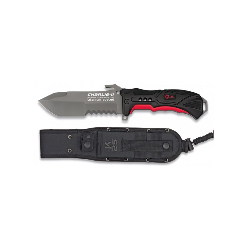 Cuchillo de la marca K25 modelo CHARLIE II, tiene una longitud total de 26,5 cm. Consta de una hoja fabricada en acero 7CR17MOV de 4,2 mm de grosor y 13 cm. de largo, la empuñadura mide 13, 5 cm. de aluminio engomado color negro/rojo, que hace que tenga un agarre fuerte y cómodo. Funda de nylon de color negra con apertura rápida y compatible con sistema molle.
